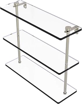 Foxtrot 22 two tiered glass shelf with towel bar, satin nickel by allied brass (28) $139. Family values, integrity, and innovation. Gatco 4646 glam glass shelf satin nickel. Freestanding bathroom shelves (21) wall mount bathroom shelves (4649) shelf material. Choose a chrome and glass bathroom shelf or a brushed nickel shelf for versatility that works with a wide range of interior design schemes.
